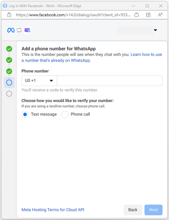 locked. To fix the problem, delete the Phone Number and WhatsApp Business Account on the META portal. If you can't delete your WhatsApp Business Account, open a Support Case for manual assistance.Once you complete the form, select Next to continue.