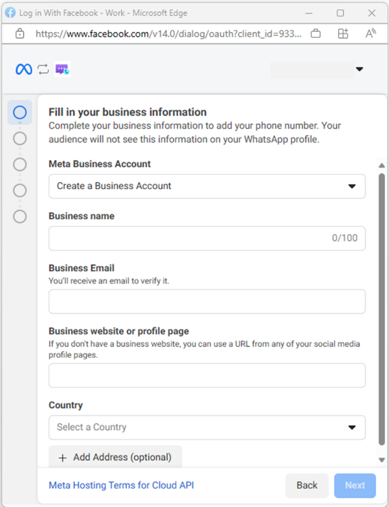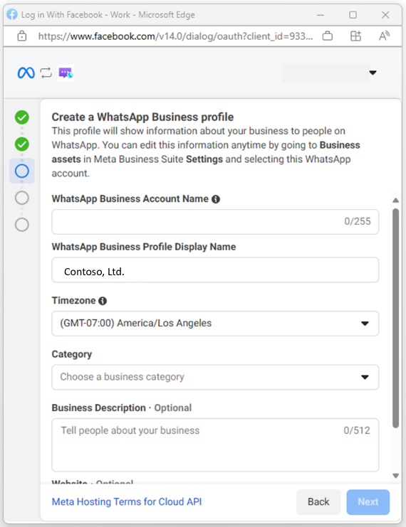 After selecting Meta Business Account, you need to create/select a WhatsApp Business profile. Fill out the required information.