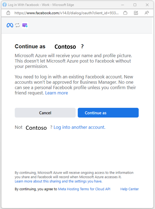 The next screen notifies you that the Azure Communication Services app will receive your name and profile picture. It gives permission to Azure Communication Service APIs to manage your WhatsApp Business Account.