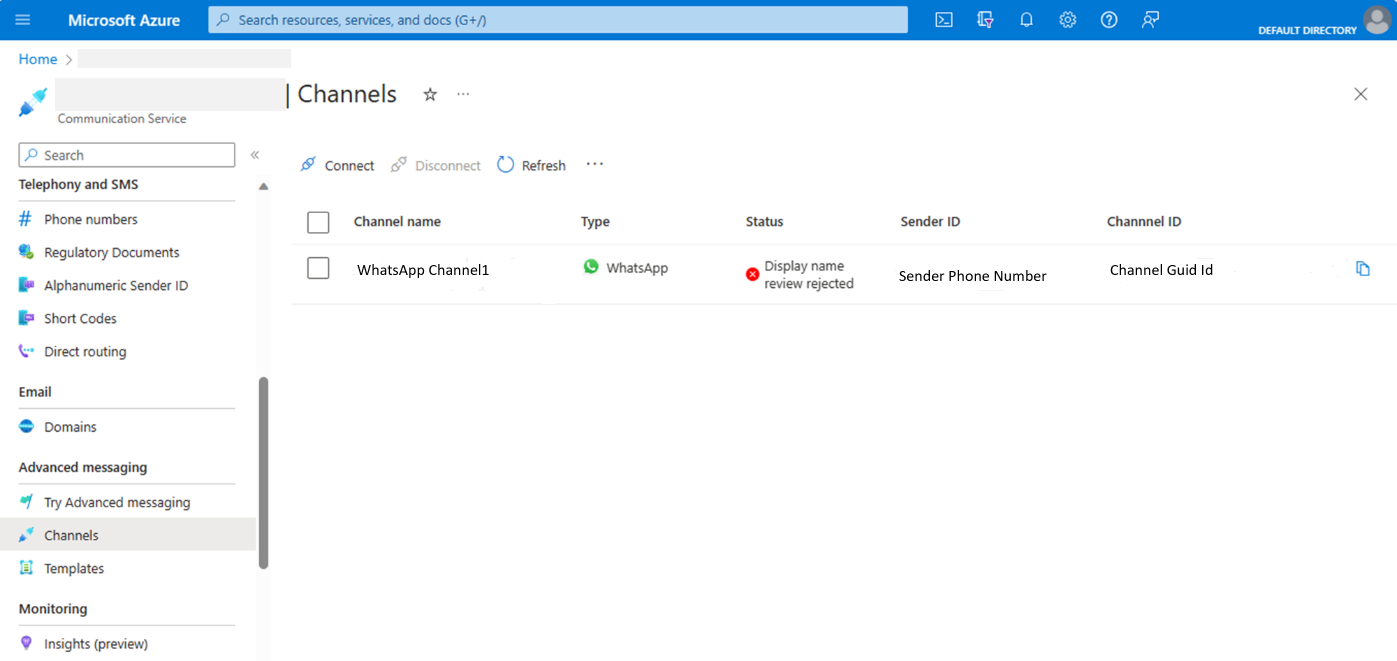 You see the account and status listed in the Azure portal along with the other WhatsApp Business accounts that you connected to Azure Communication Services. Once approved, you can use the WhatsApp Business account to send and receive messages. The status of your WhatsApp Business account is displayed in the Azure portal. Meta reviews your business’s display name. You can learn more about this review process and how to update your business account’s display name in the article About WhatsApp Business display name.