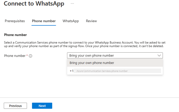 This screen you either see the Azure Communication Services phone number or you enter the phone number, which you verify as part of the WhatsApp Business account signup.