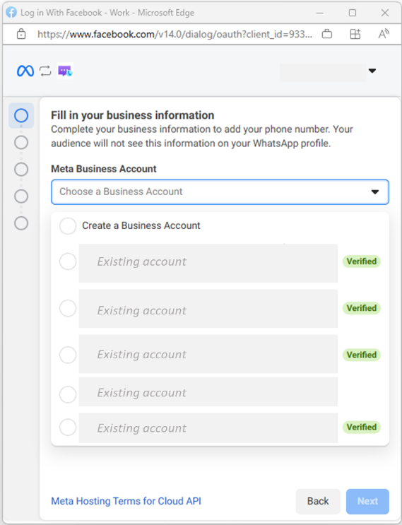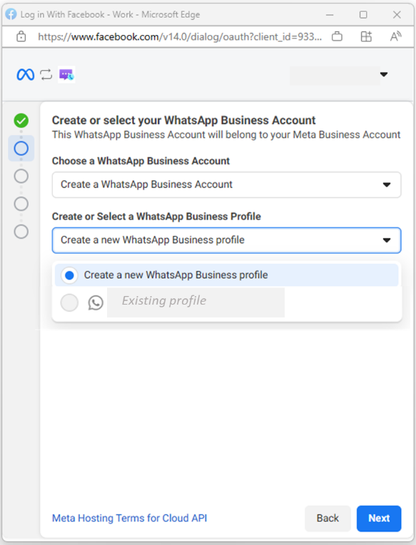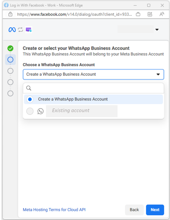 Next you're asked to create a WhatsApp Business Account or select an existing one.