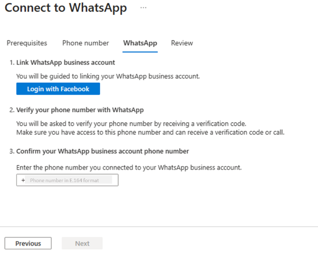 To get started, you connect a new or existing WhatsApp Business Account with your Azure Communication Services resource in the Azure portal. The process is initiated in the Azure portal. This option opens a new browser window for you to complete a signup process using Facebook’s signup wizard.