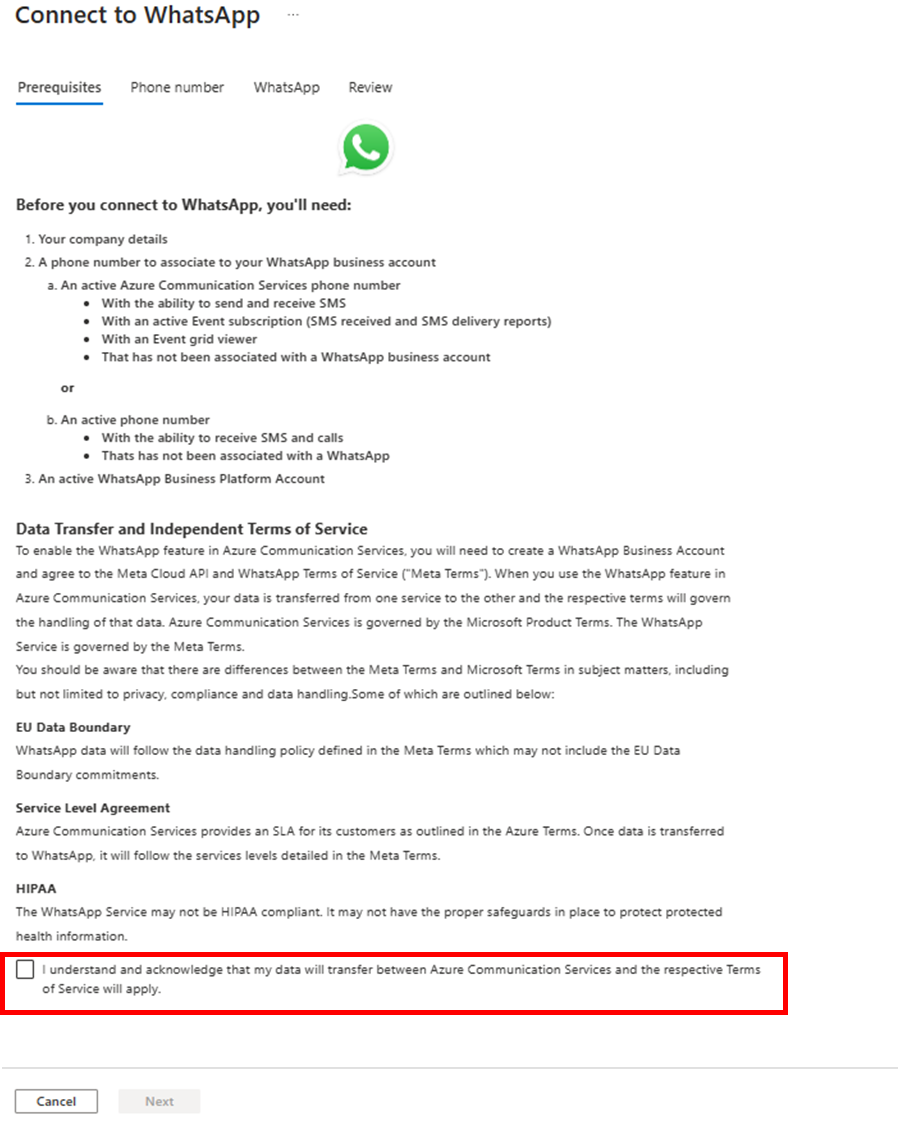 Before you connect to WhatsApp, you need to complete the Prerequisites and acknowledge the Data Transfer and Independent Terms of Service.