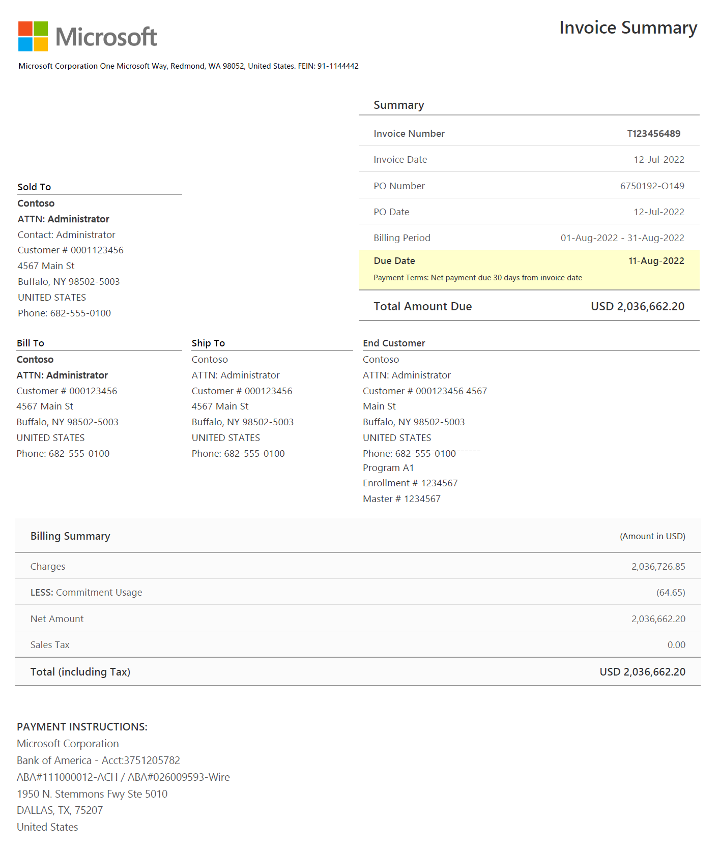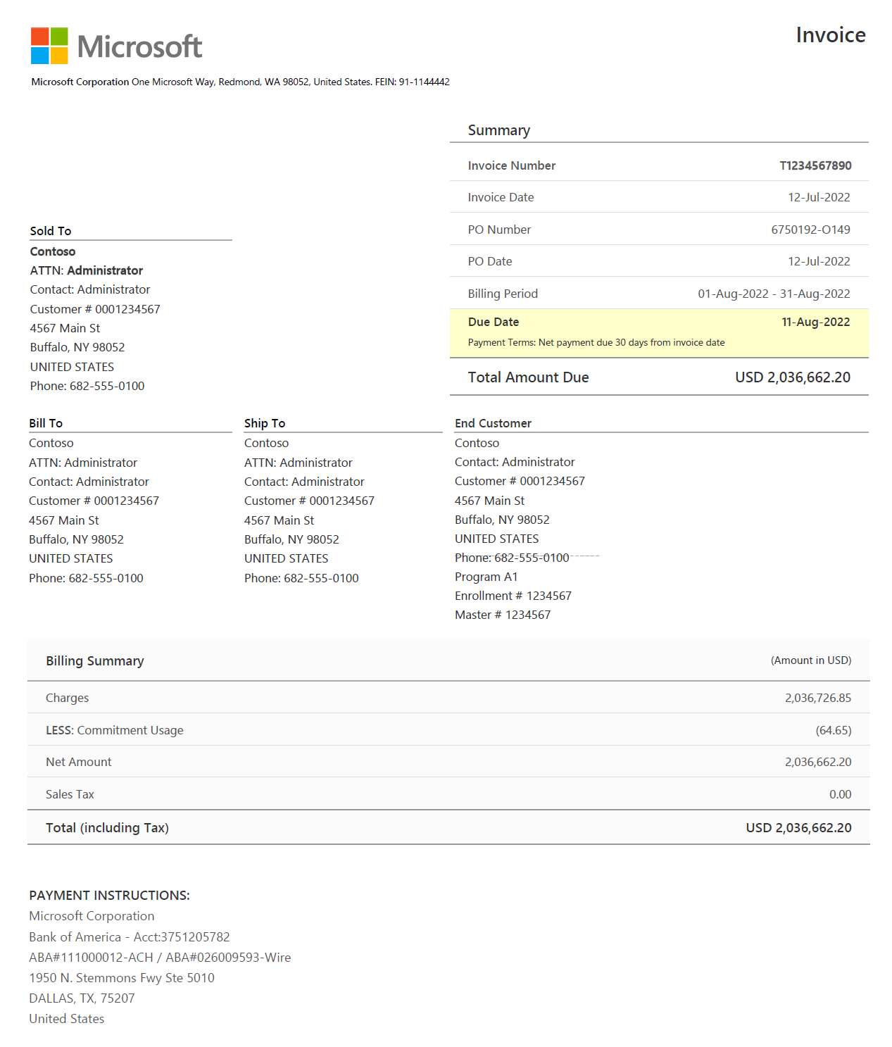 Due Date - The date when the invoice payment is due to Microsoft.