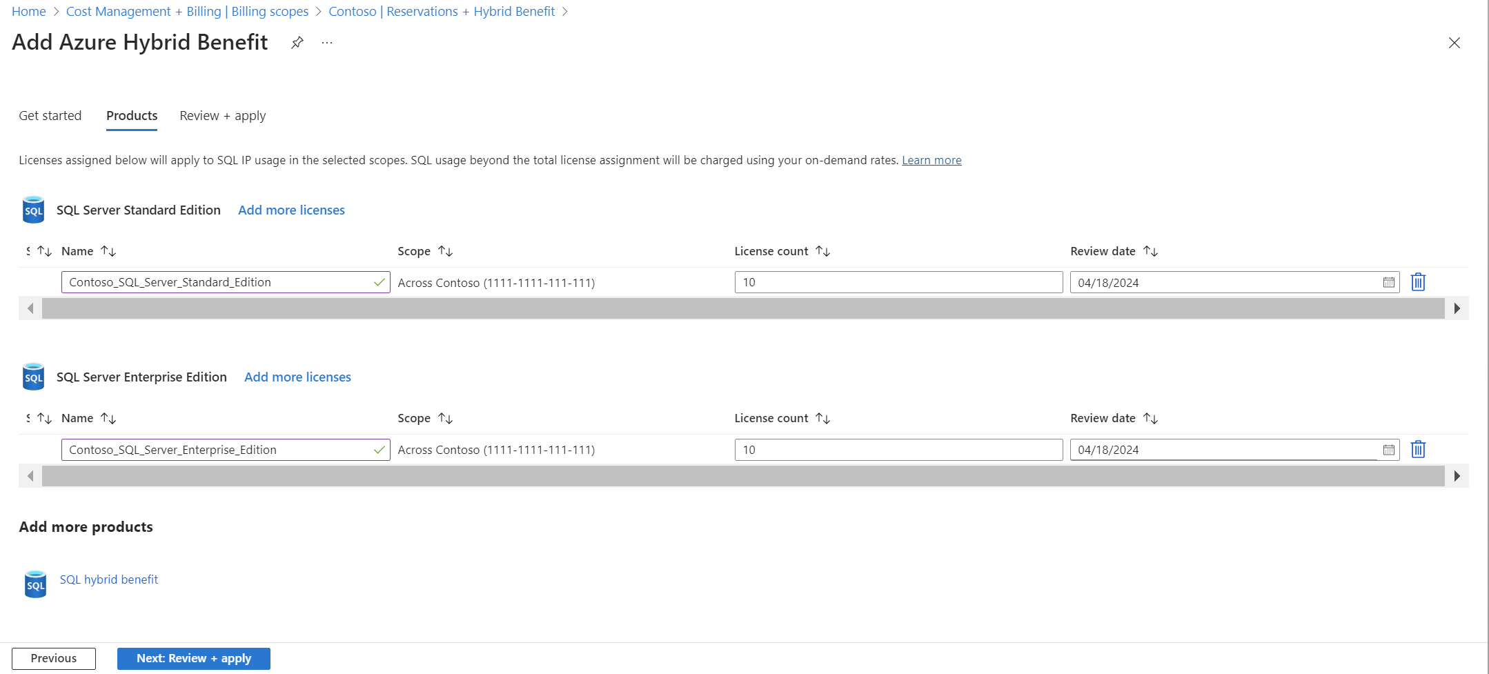After you review your choices, select Next: Review + apply.
