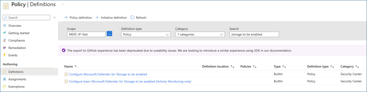This policy enables all Defender for Storage capabilities: activity monitoring, malware scanning, and sensitive-data threat detection. You can also get it here: List of built-in policy definitions. If you want to enable a policy without the configurable features, use Configure basic Microsoft Defender for Storage to be enabled (Activity Monitoring only).