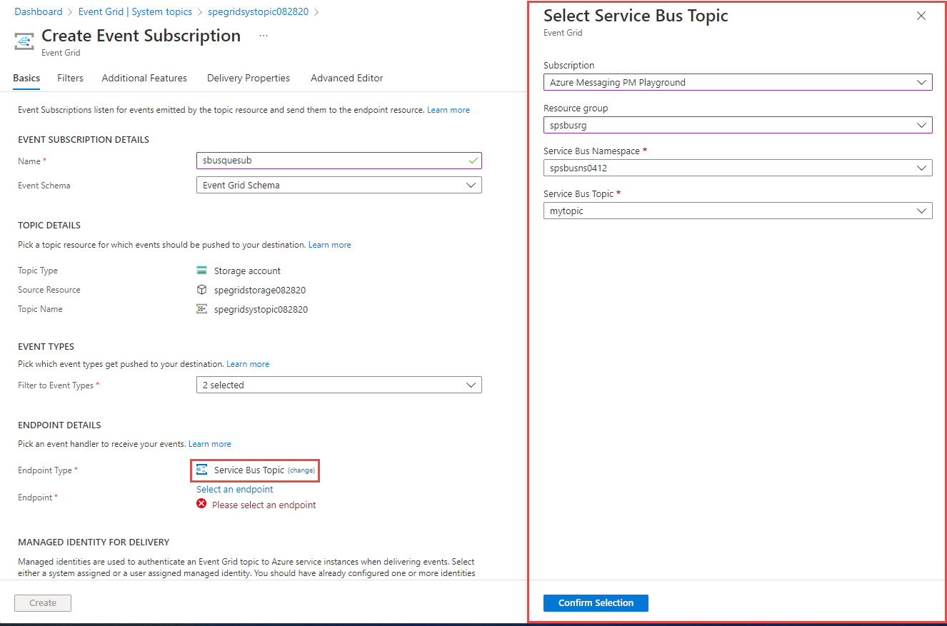 In the Azure portal, while creating an event subscription, select Service Bus Topic as the endpoint type and then click select an endpoint to choose a Service Bus topic.