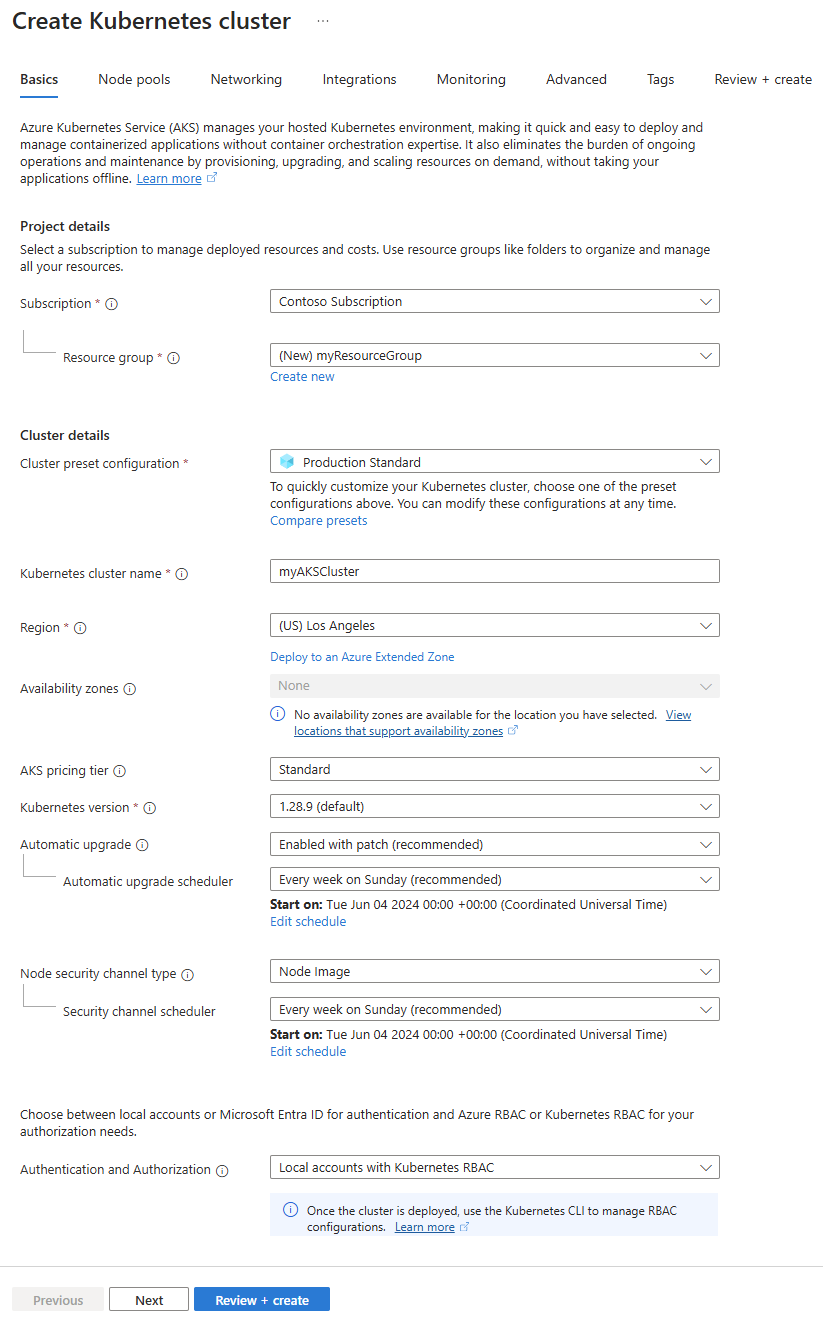 On the Basics tab of Create Kubernetes cluster, enter or select the following information:
