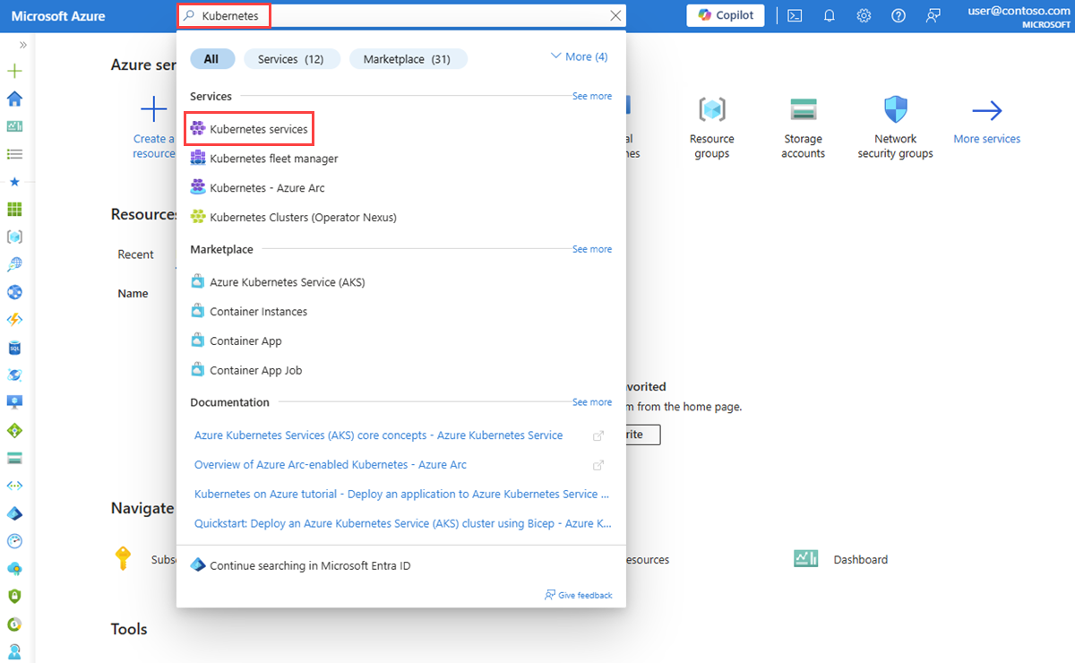 In the search box at the top of the portal, enter Kubernetes. Select Kubernetes services from the search results.