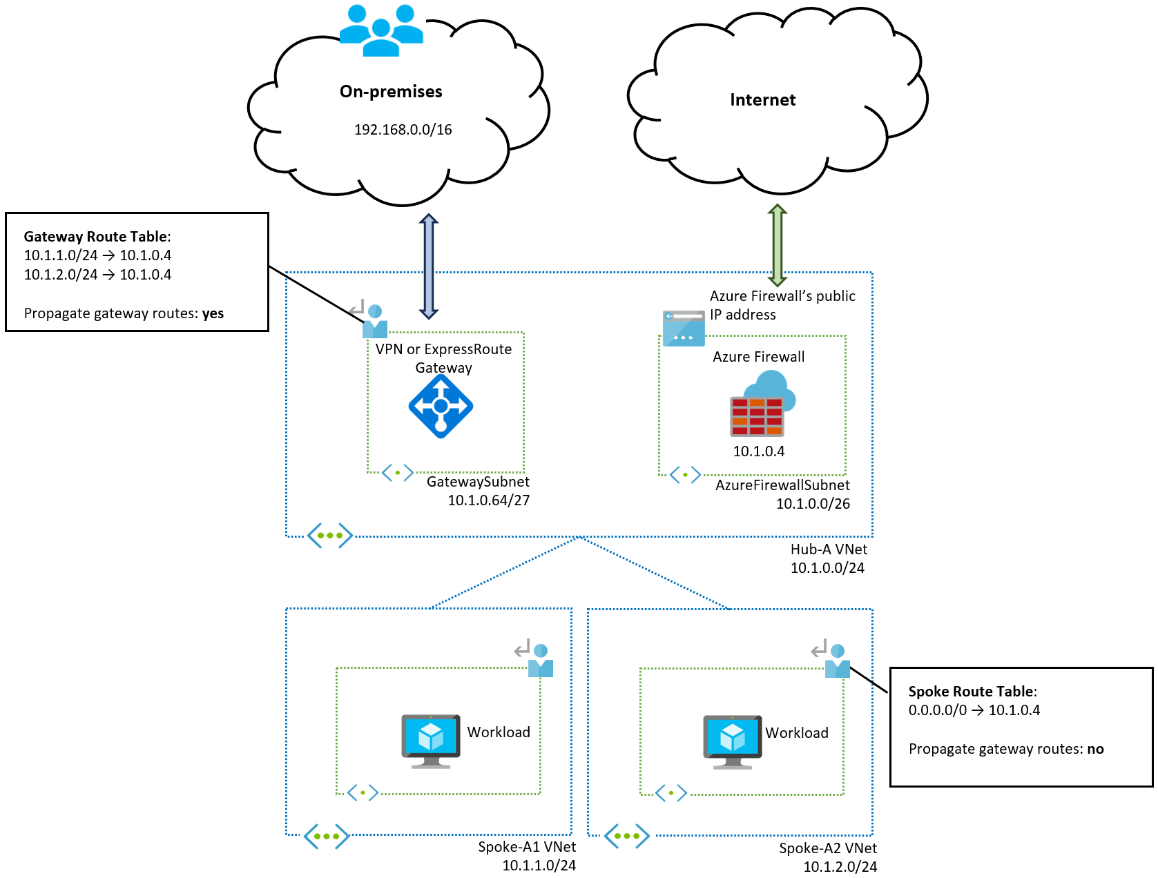 - On-premises-to-spoke traffic: Traffic arrives from the on-premises network to the VPN or ExpressRoute gateways. With default routing in Azure, a system route is created in the GatewaySubnet (and other subnets in the hub virtual network) for each spoke. You must override these system routes and set the next hop to the Azure Firewall's private IP address. In this example, you need two routes in a route table associated with the gateway subnet, one for each spoke (