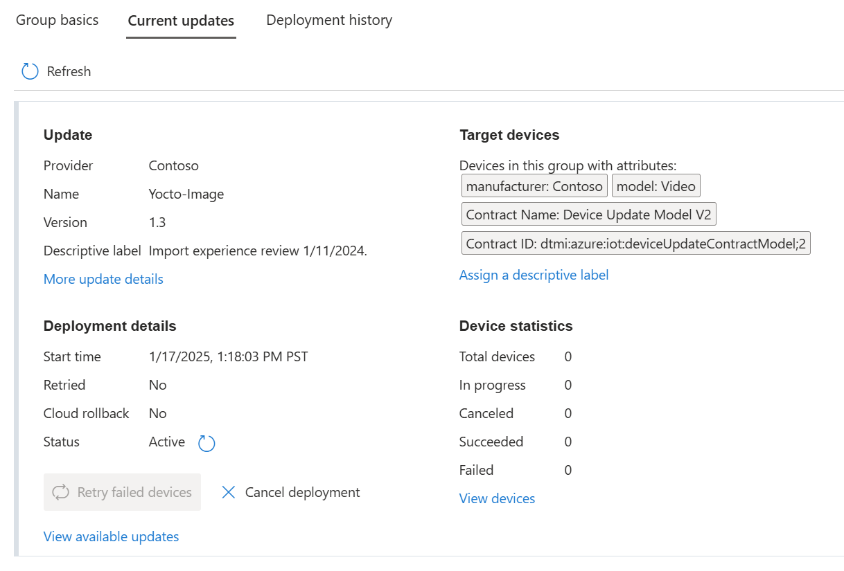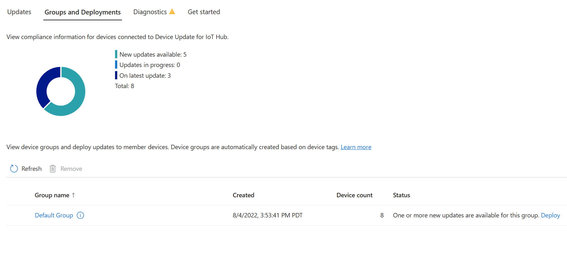 On the Updates page, select the Groups and Deployments tab and view the update compliance chart and device group list. You might need to refresh the view to see recently imported updates available for your device group.