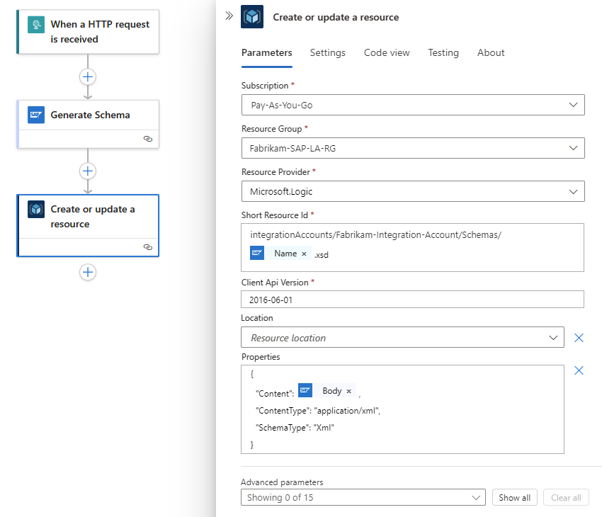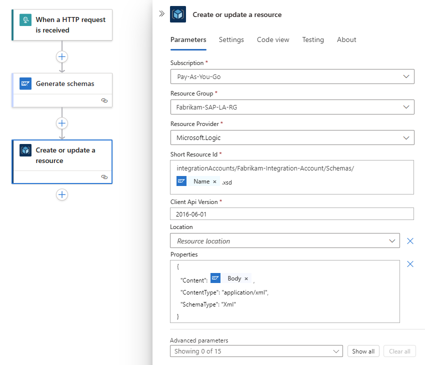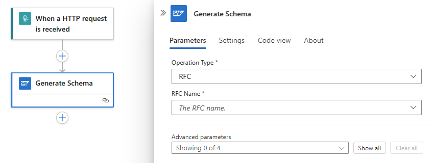 This how-to guide shows how to create an example logic app workflow that generates schemas for SAP artifacts. The workflow starts with a Request trigger that can receive HTTP POST requests from your SAP server. The workflow then generates schemas for the specified IDoc and BAPI by using the SAP action named Generate schemas that sends a request to your SAP server. To send this request, you can use either the generic SAP managed connector action named Send message to SAP, or you can use the specific SAP managed or built-in action named [BAPI] Call method in SAP. This SAP action returns an XML schema without the contents or data in the XML document itself. The workflow then uploads the schemas returned by the response to an integration account by using an Azure Resource Manager connector operation.