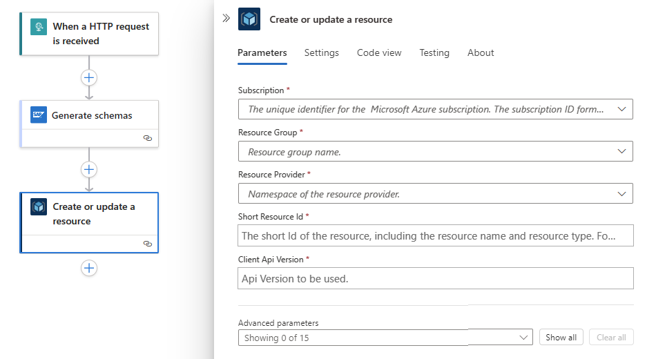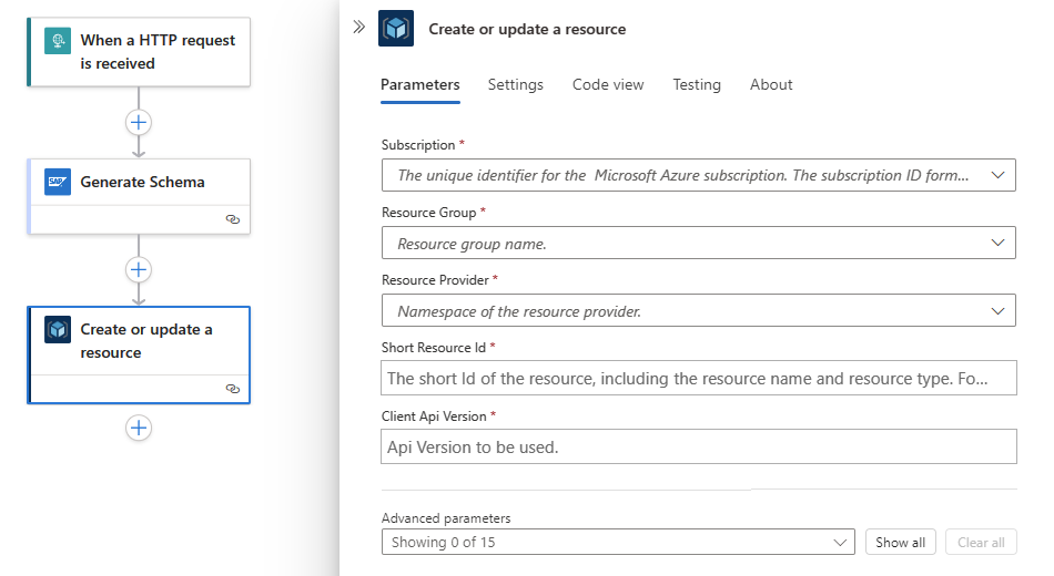 In the workflow designer, under the Generate schemas action, follow these general steps to add the Azure Resource Manager managed action named Create or update a resource.