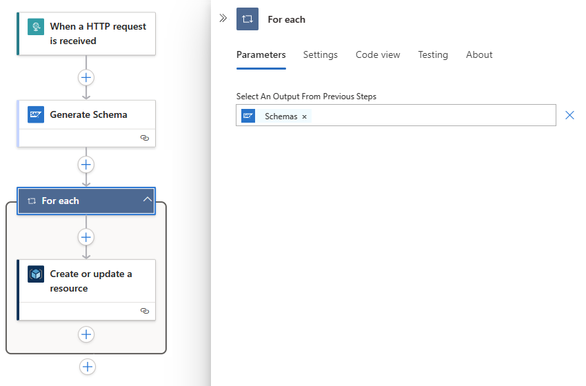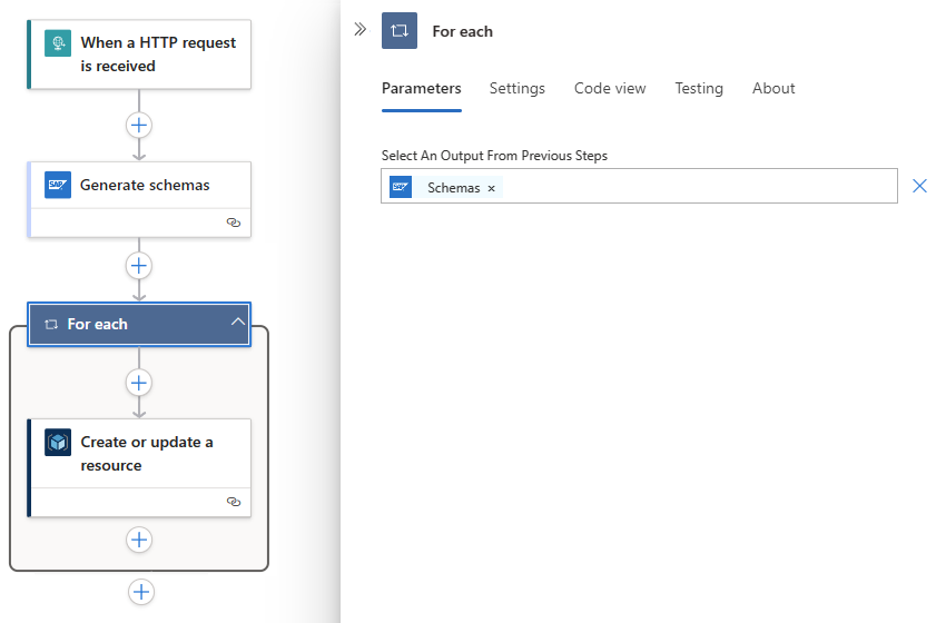 The Generate schemas action generates schemas as a collection, so the designer automatically adds a For each loop around the Azure Resource Manager action, for example: