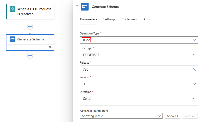 This example selects IDOC. If you select a different operation type, the available parameters change based on your selection.