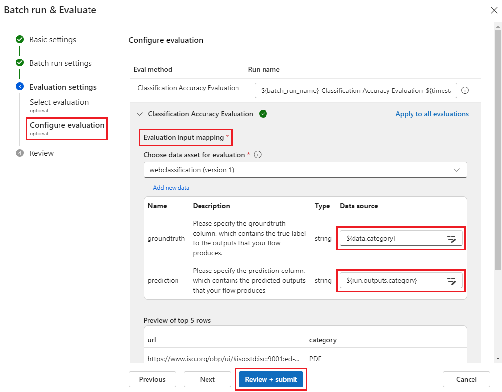 On the Configure evaluation screen, set Evaluation input mapping to map groundtruth to flow input ${data.category} and map prediction to flow output ${run.outputs.category}.