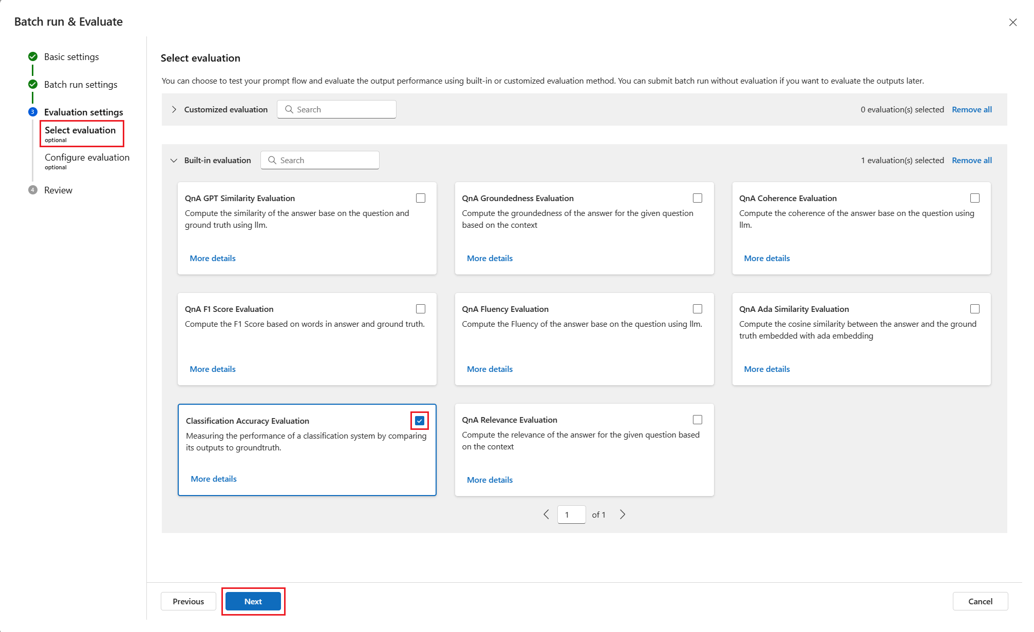 Select Next to optionally select one or multiple evaluation methods. The Select evaluation page shows built-in and customized evaluation flows. To see how the metrics are defined for built-in evaluation methods, you can select More details on the method's tile.