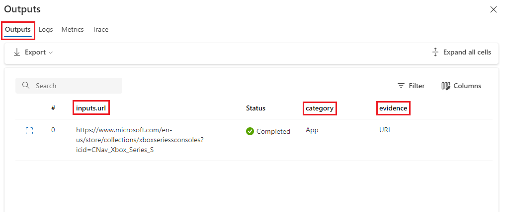 On the Outputs tab of the Outputs screen, note that the flow predicts the input URL with a category and evidence.