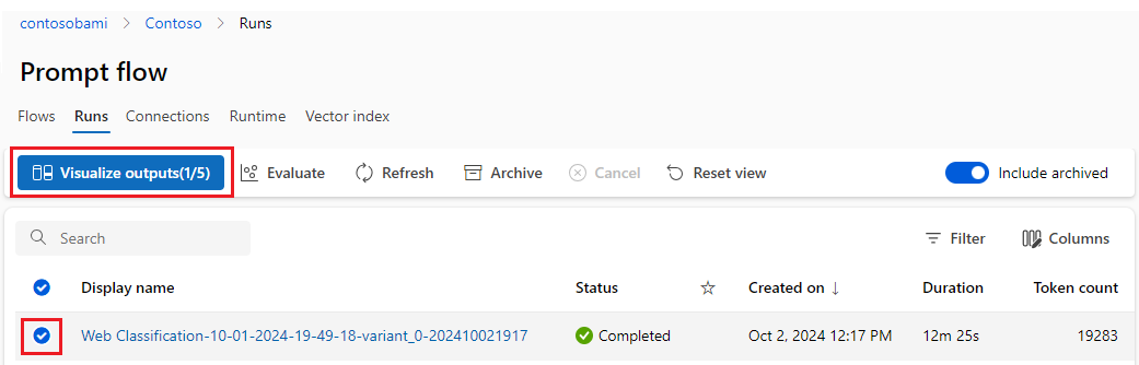 After the batch run completes, select the check next to the run and then select Visualize outputs to view the result of your batch run.