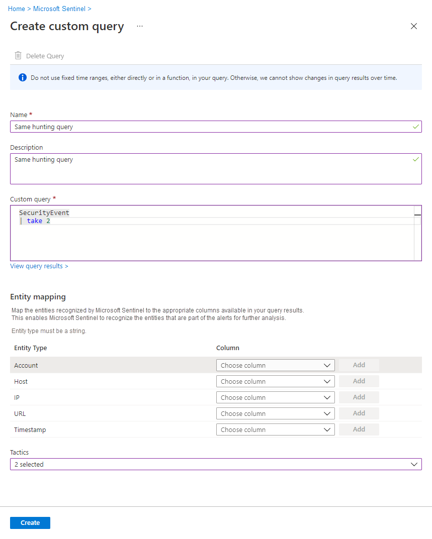 In Microsoft Sentinel, create a custom hunting query from the Hunting > Queries tab.