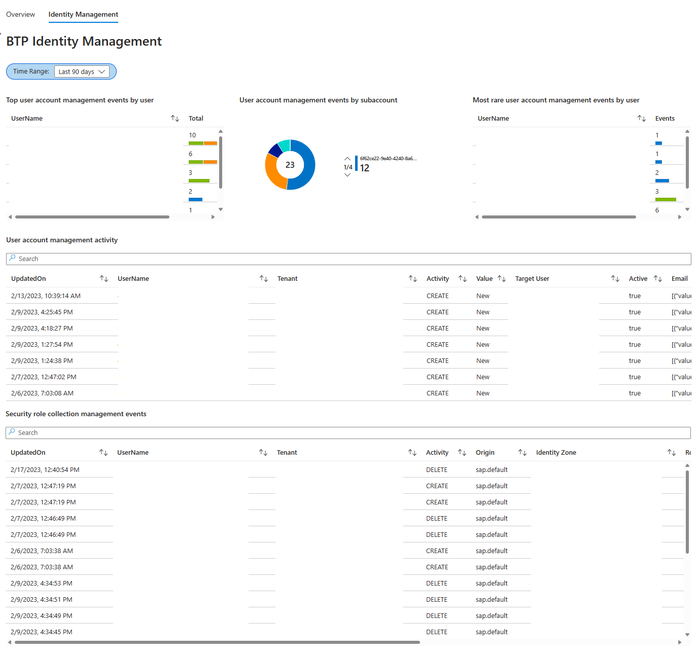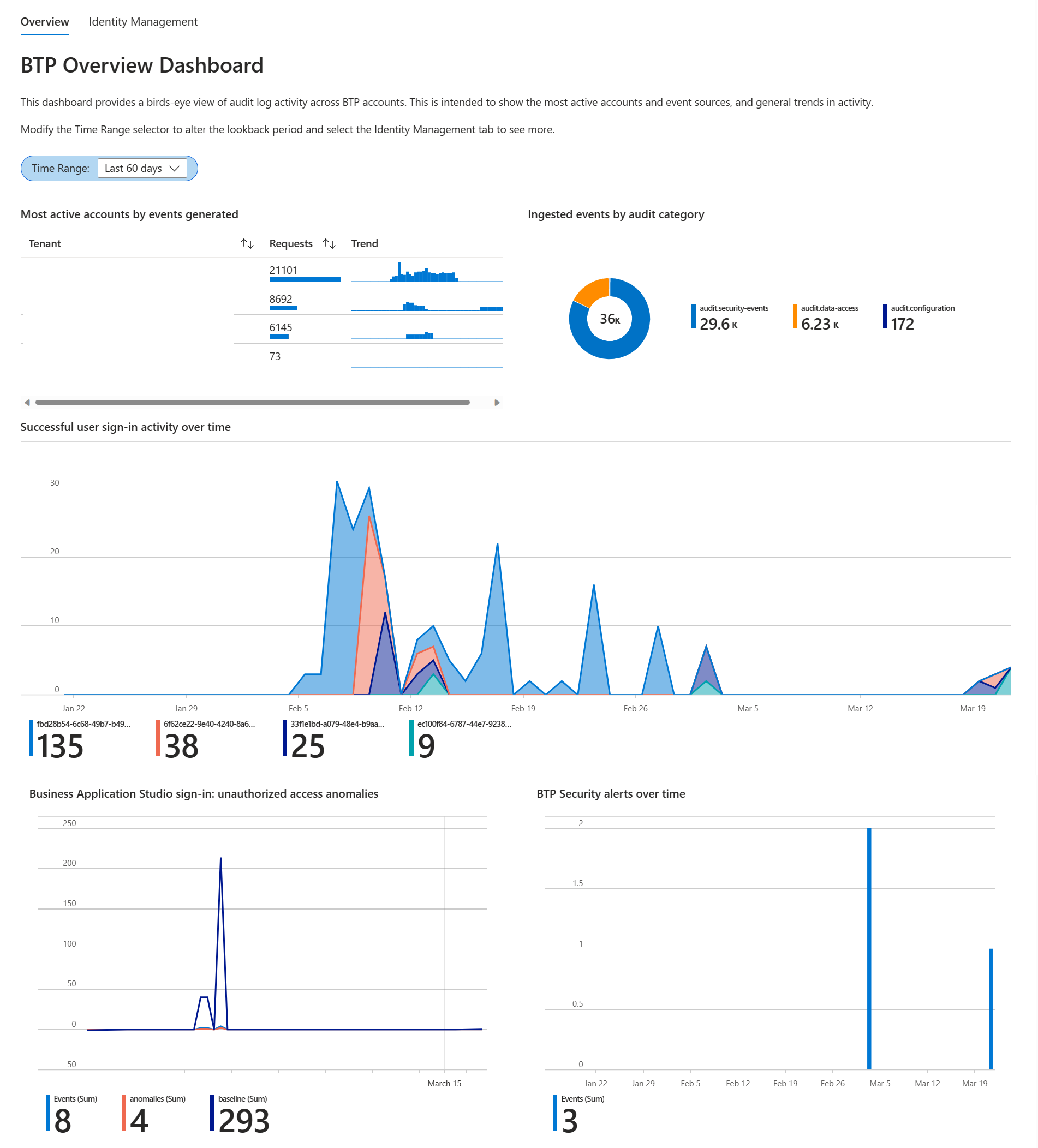- An overview of BTP subaccounts, helping analysts identify the most active accounts and the type of ingested data.