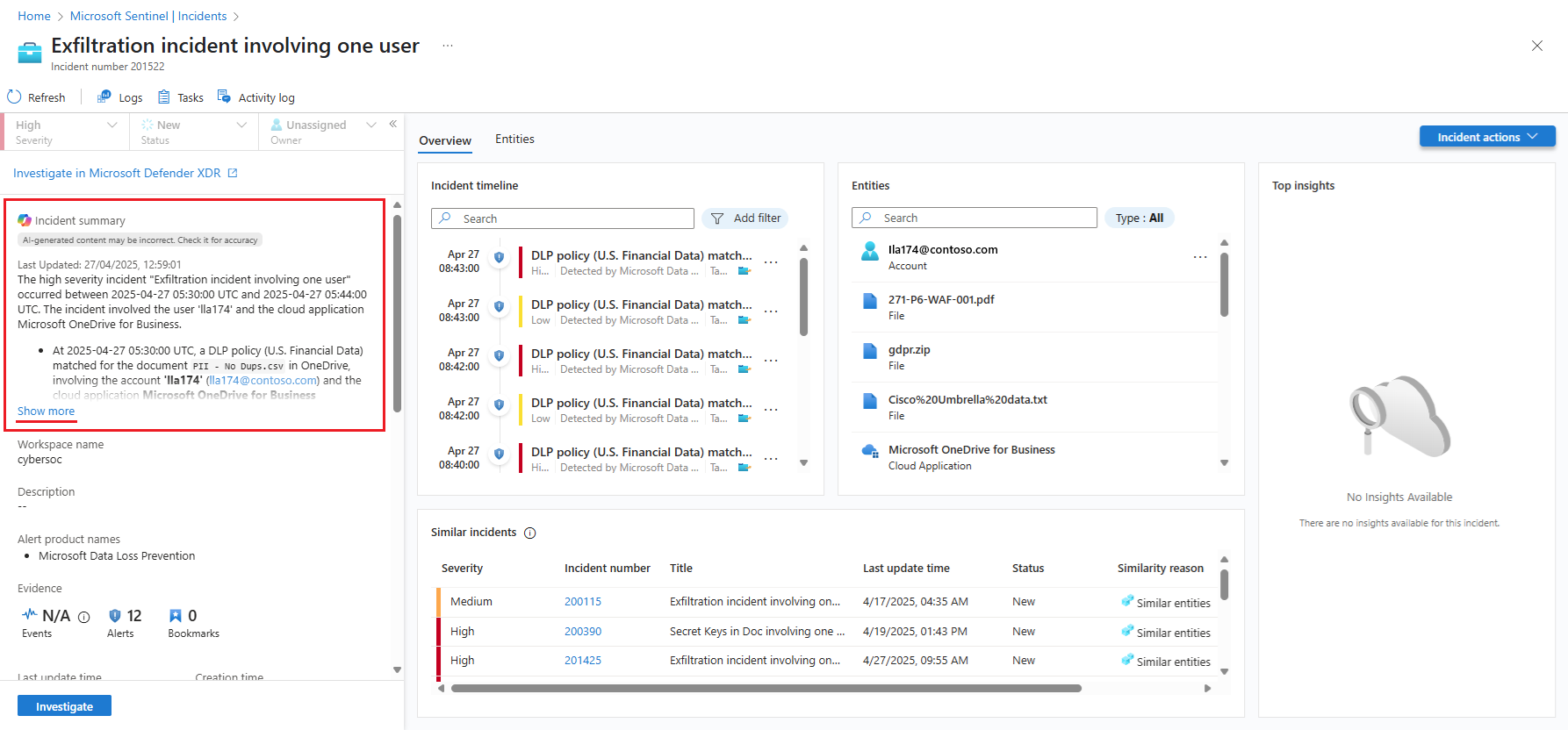Microsoft Sentinel applies the capabilities of Security Copilot in the Azure portal to create enriched summaries of incidents, providing a comprehensive overview of security incidents by consolidating information from multiple alerts. This feature enhances incident response efficiency by offering a clear summary that helps your security operations teams quickly understand the scope and impact of an incident. It provides a structured overview, including timelines, assets involved, and indicators of compromise, along with enrichments like user risk, device risk, and watchlist matching. These summaries suggest an investigation path for your analysts to assess the scope and impact of an attack. For more information, see Navigate, triage, and manage Microsoft Sentinel incidents in the Azure portal.
