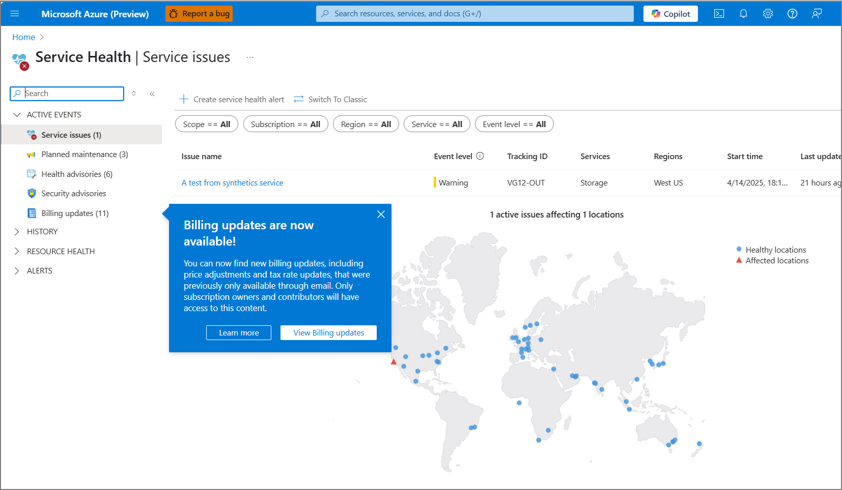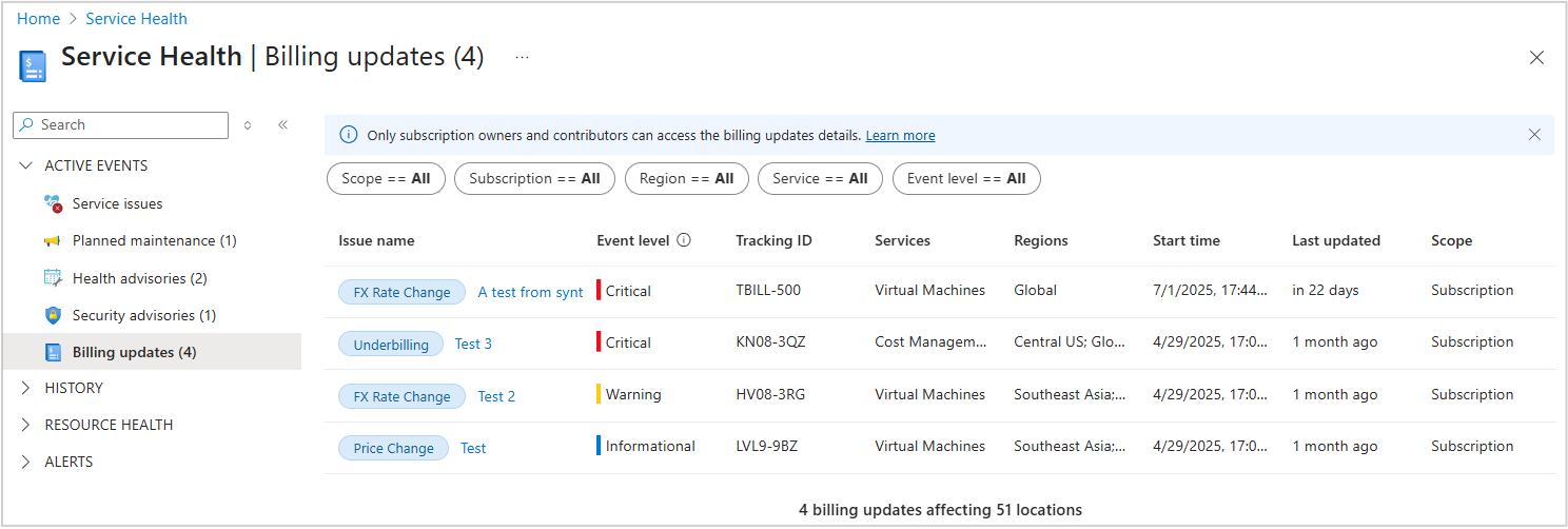 The in-portal billing communication in Service Health shows billing updates for users with the subscription owner or subscription contributor roles. These users can view updates in both the Billing Updates pane and the Service Health API.