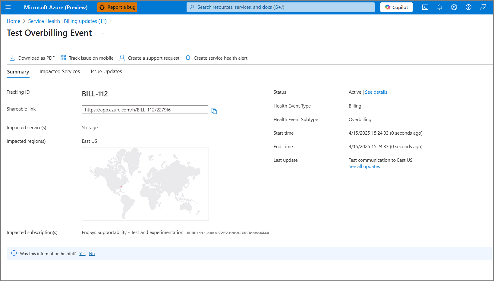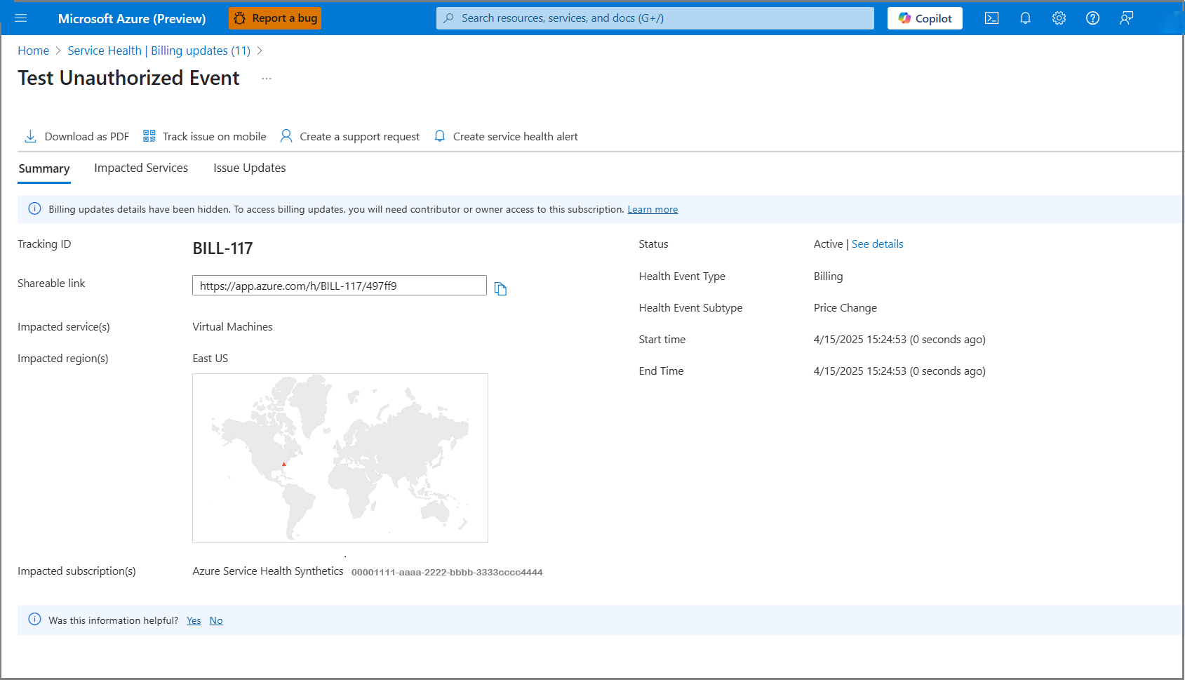 The detail pages for billing communication event types appear in the Billing Updates pane in Service Health. Only users with elevated access can open the pane.