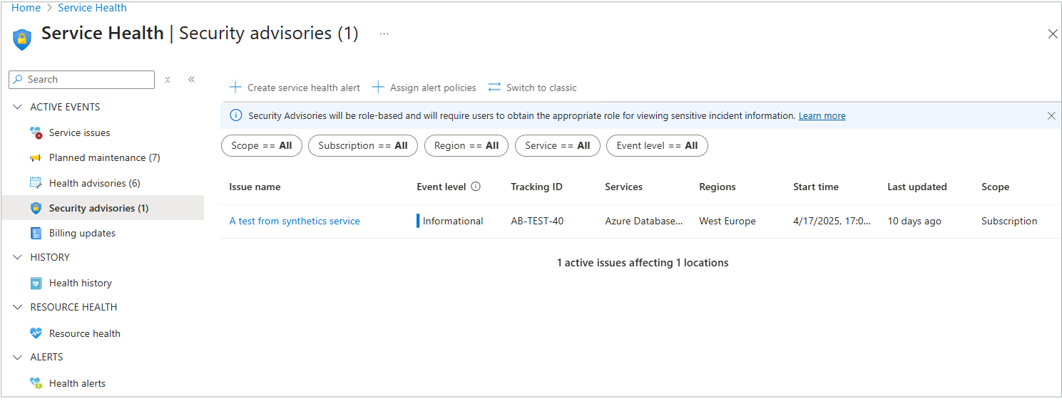 The Service issues, Health advisories, Security advisories, and Health history panes show events at both the Tenant and Subscription levels. For more information about roles, see Role-based access control (RBAC) for security incident resource impact.