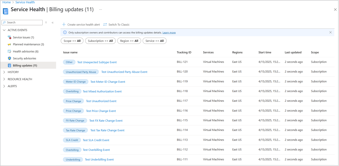 Select Billing updates from the left menu to see billing updates. Only users with subscription owner or contributor permissions can access this information.