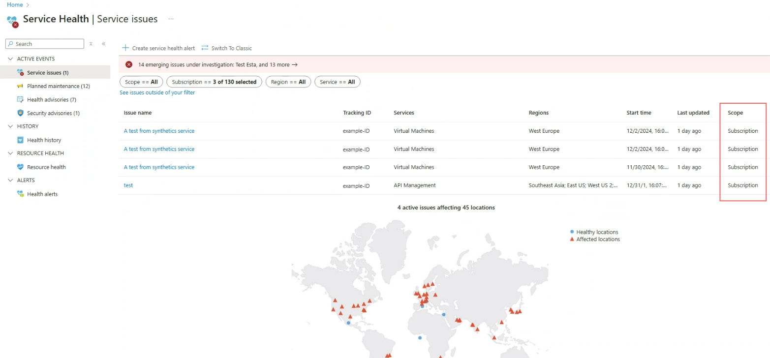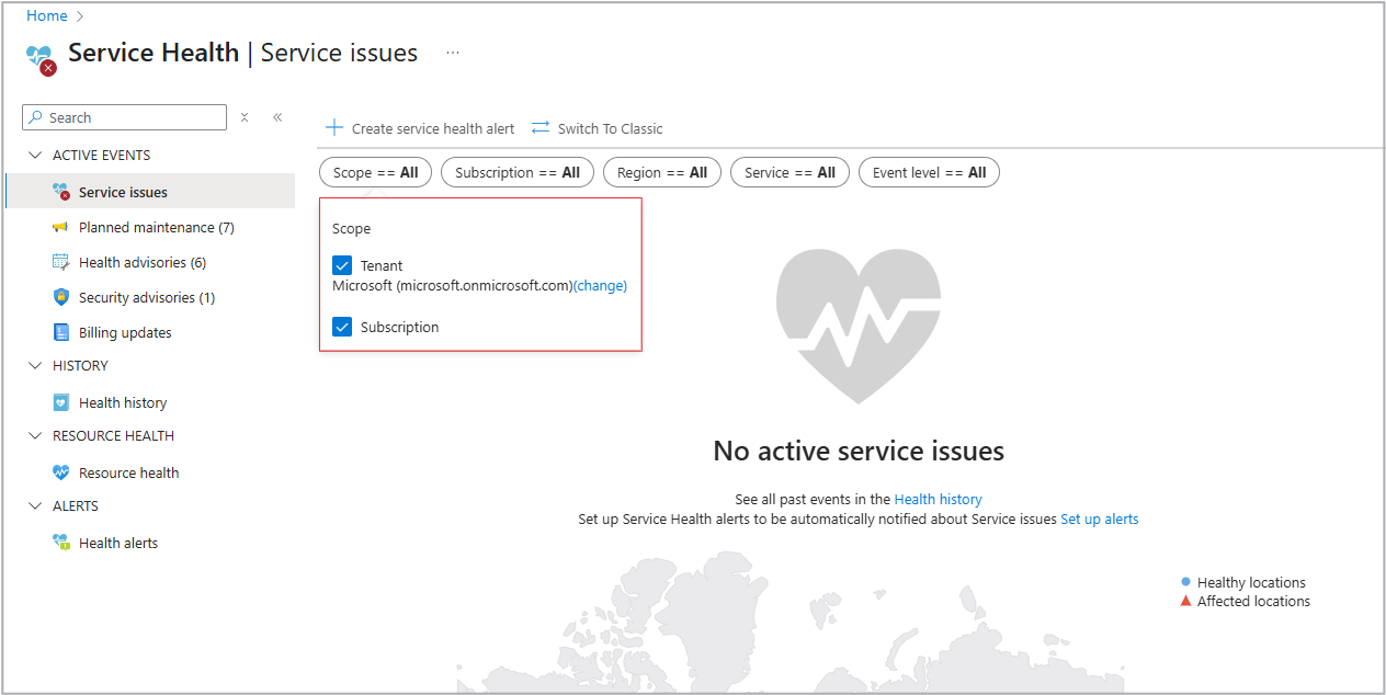 On the Service issues pane, you can filter by Scope. The Scope column indicates when an event is affecting the Tenant level or Subscription level.