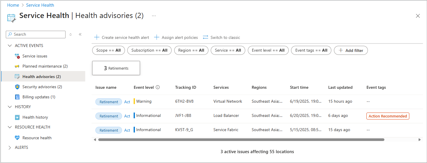 - Security advisories: Security-related notifications or violations that might affect the availability of your Azure services.