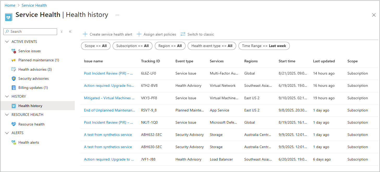 Select Health history from the left menu to see a detailed view of the health status of your Azure services and resources. You can monitor outages, track incidents and configure alerts.