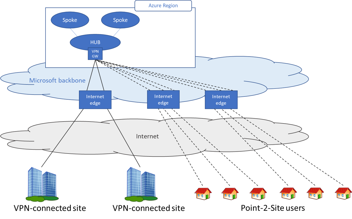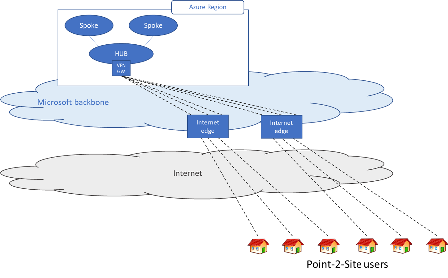 A point-to-site (P2S) VPN gateway connection lets you create a secure connection to your virtual network from an individual client computer. A P2S connection is established by starting it from the client computer. This solution is useful for telecommuters who want to connect to Azure VNets or on-premises data centers from a remote ___location, such as from home or a conference. For more information about Azure point-to-site VPN, see About VPN Gateway point-to-site VPN and the VPN Gateway FAQ.