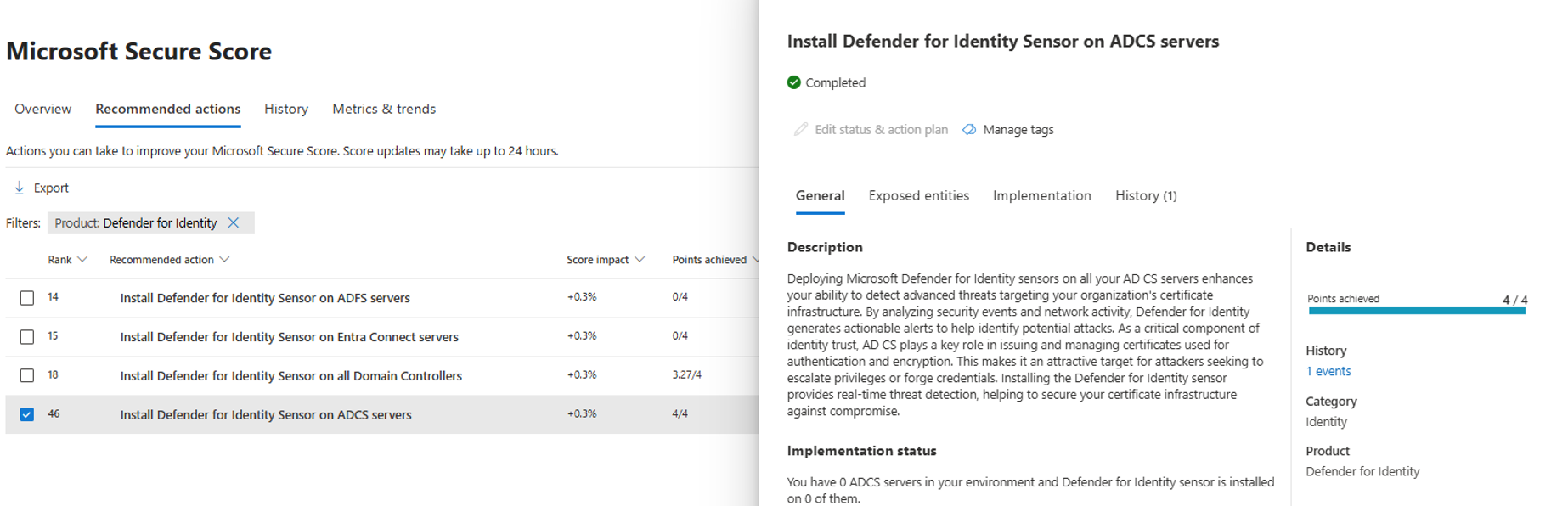 - Review the recommended action at https://security.microsoft.com/securescore?viewid=actions to discover which of your AD CS servers are unmonitored.