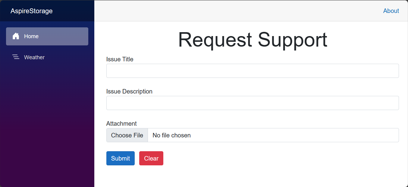 TitleandDescriptionform fields and select a simple file to upload.Select the Submit button, and the form submits the support ticket for processing — and clears the form.