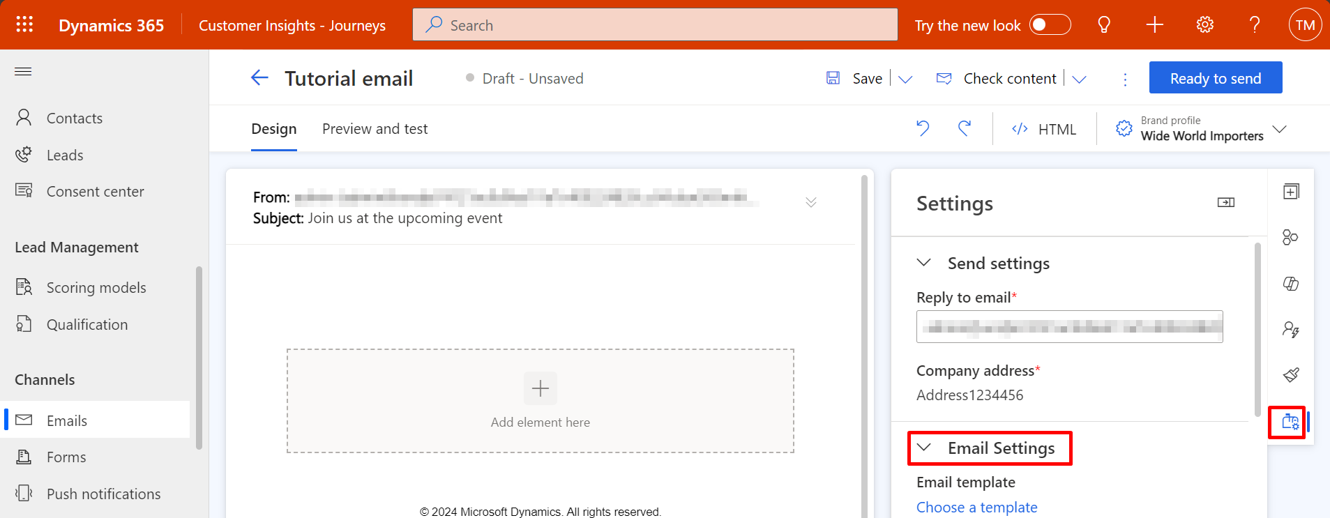 The email content designer resembles the other digital content designers provided in Dynamics 365 Customer Insights - Journeys. Work with it as follows: