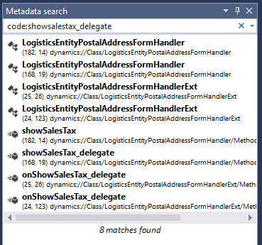 The Metadata search tool, described on the Metadata search in Visual Studio page, is the best way to find either delegates or their handlers. In Visual Studio, go to Dynamics 365 > Metadata Search to open the metadata search tool.
