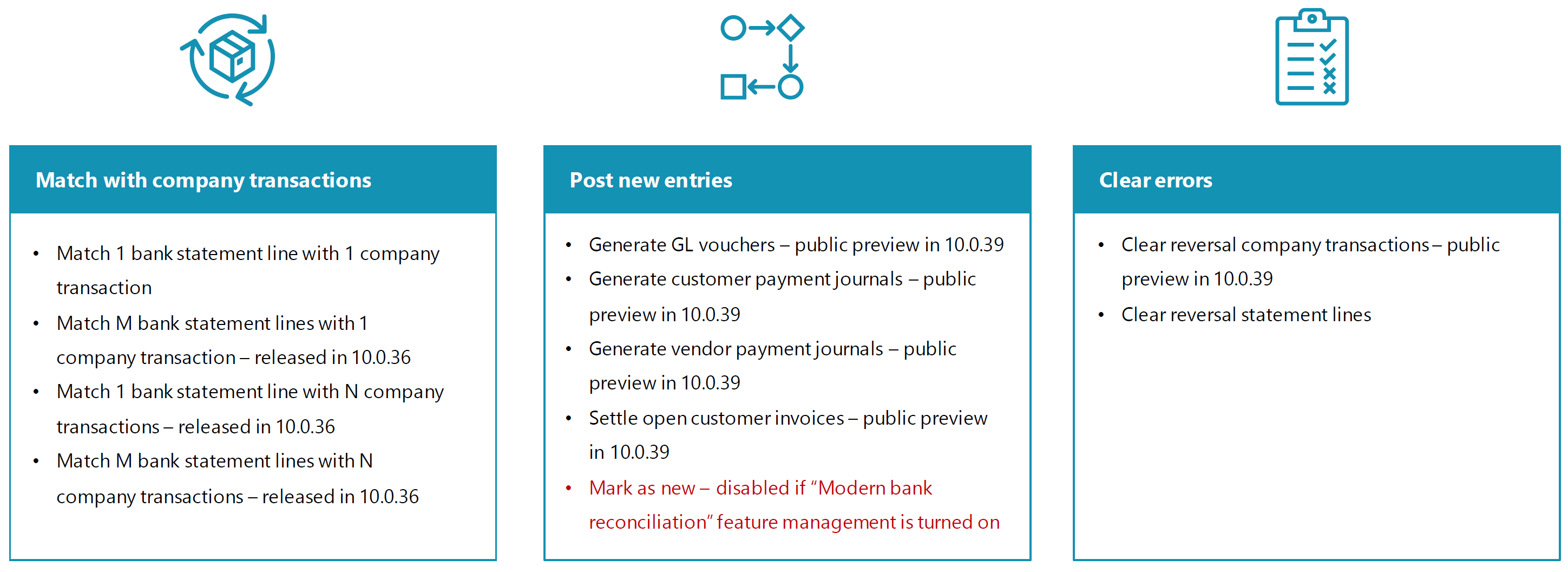 The following image details three main activities within the automatic bank reconciliation feature of Dynamics 365 Finance. The first panel, Match with company transactions, lists the capabilities of matching individual or multiple bank statement lines with company transactions. The second panel, Post new entries, describes how to generate different types of journals and manage customer invoices. The third panel, Clear errors, explains procedures for clearing reversal transactions in company accounts and bank statements.