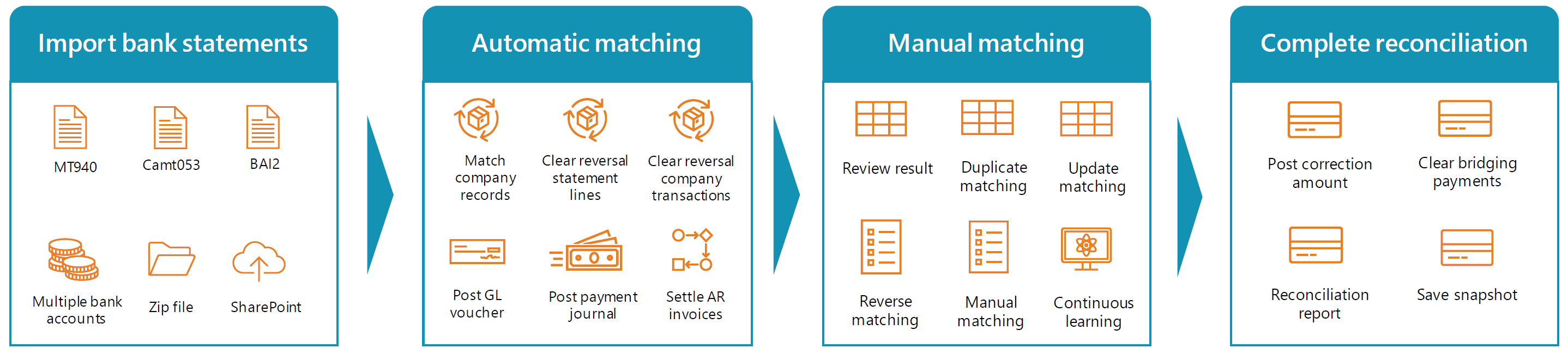 The following image provides an overview of the advanced bank reconciliation process in Dynamics 365 Finance. It describes the end to end workflow for reconciling bank statements with company records.