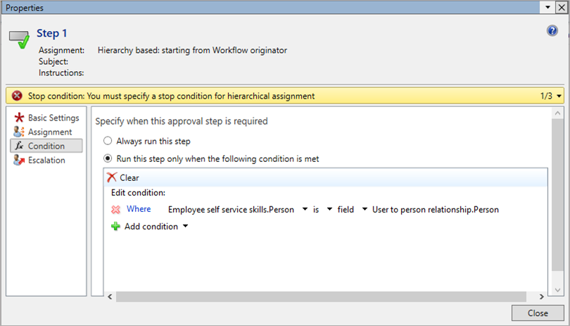 Select Add condition. After Where, select Employee self service skills, and then select Employee self service skills.Person. After is, select field, and then select User to person relationship.Person.