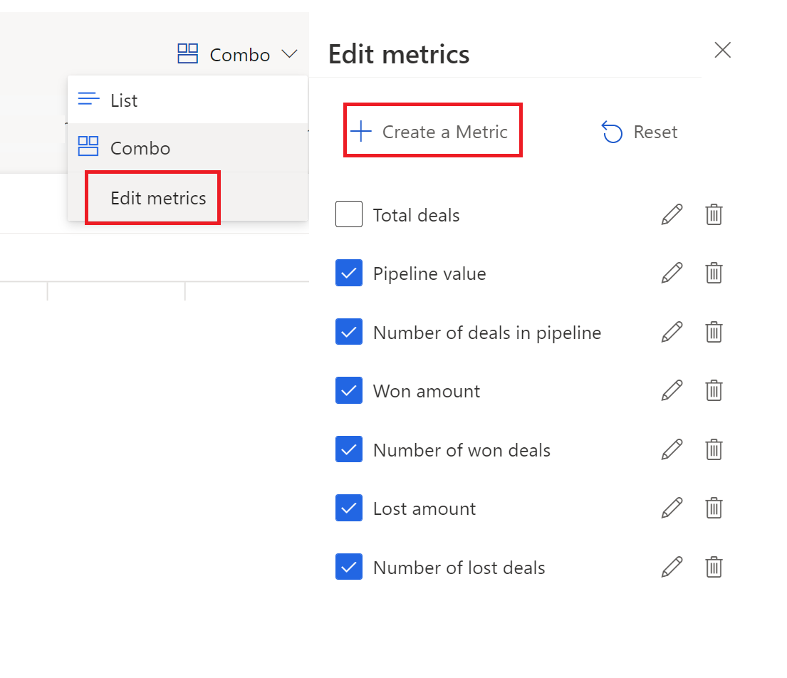 To edit a metric, hover over the metric in the Edit metrics side panel and select the Edit icon.