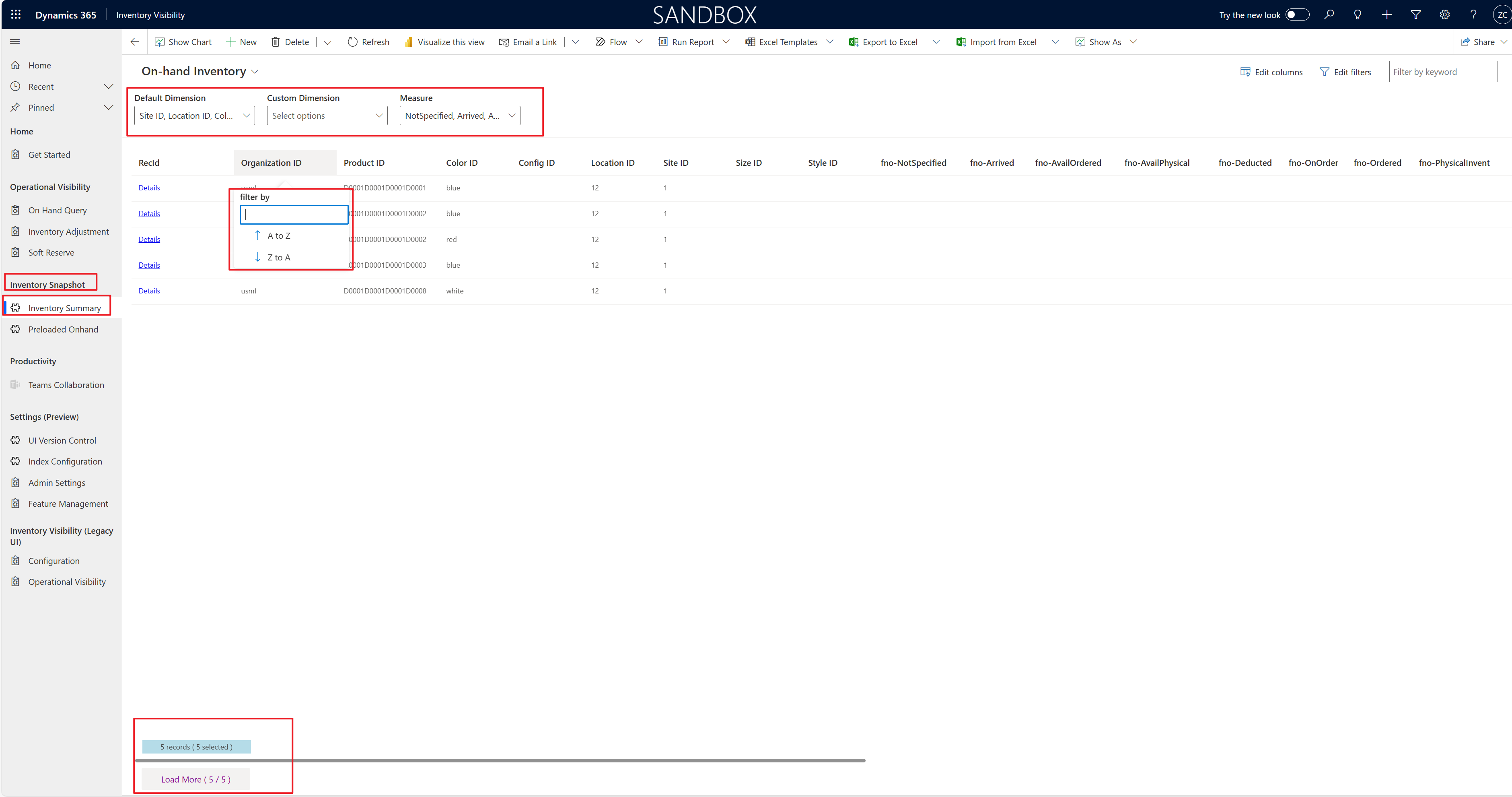 - On the Inventory summary page, there are three fields above the grid: Default dimension, Custom dimension, and Measure. Use these fields to control which columns are visible. You can also select any column header in the grid to filter or sort the current result by that column.