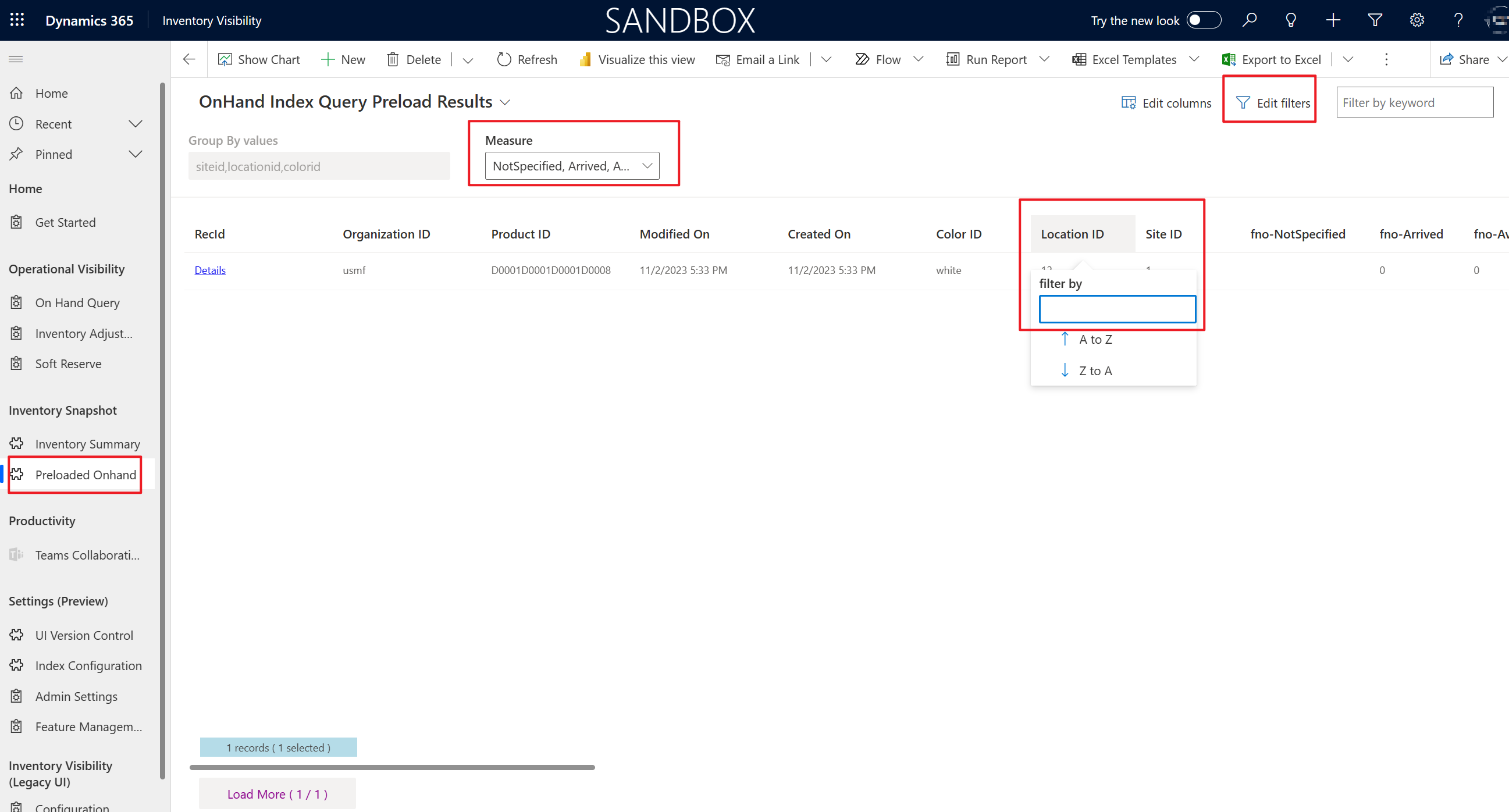 The Onhand index query preload results page provides a view for the On-hand Index Query Preload Results entity. Unlike the Inventory summary entity, the On-hand Index Query Preload Results entity provides an on-hand inventory list for products together with selected dimensions. Inventory Visibility syncs the preloaded summary data every 15 minutes.