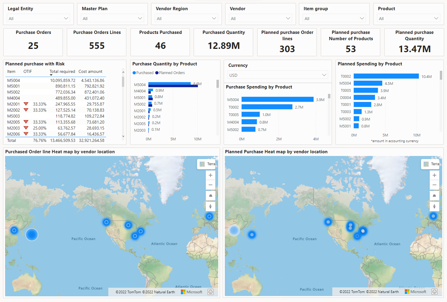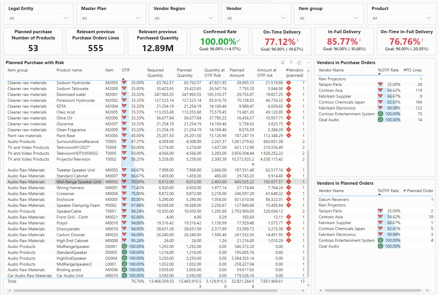 Microsoft Dynamics 365 Supply Chain Management provides an integrated risk and performance report, and also two reports that are embedded into the Supply risk assessment workspace (supplier performance analysis and risk assessment analysis). All three reports use Power BI and are based on the same metrics as the workspace. Each report offers rich filtering and data slicing options to help you identify the most pressing supplier performance issues and potential risks for planned supply.