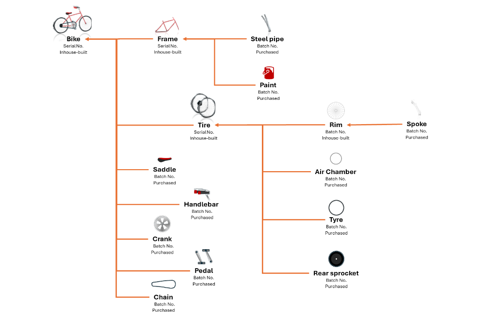 The demo data describes the components of a manufactured bicycle. The following illustration shows the bill of materials (BOM) structure of the bicycle.