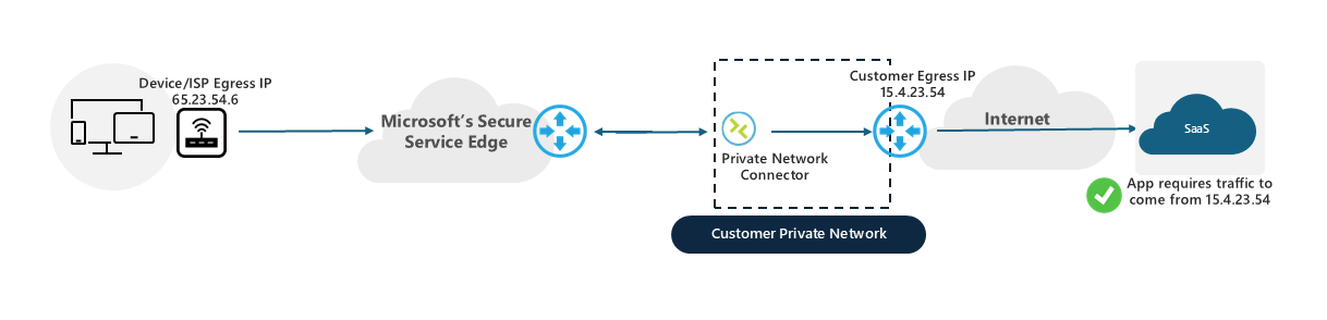 This solution acquires application traffic and routes it from the client device. It routes through Microsoft's Secure Service Edge then to a private network with a private network connector. From the private network, the traffic can access the application with internet or any other available private connection. The application sees the traffic as originating from the allowed egress IP address indicating that access is coming from the dedicated network that satisfies its own network access controls.