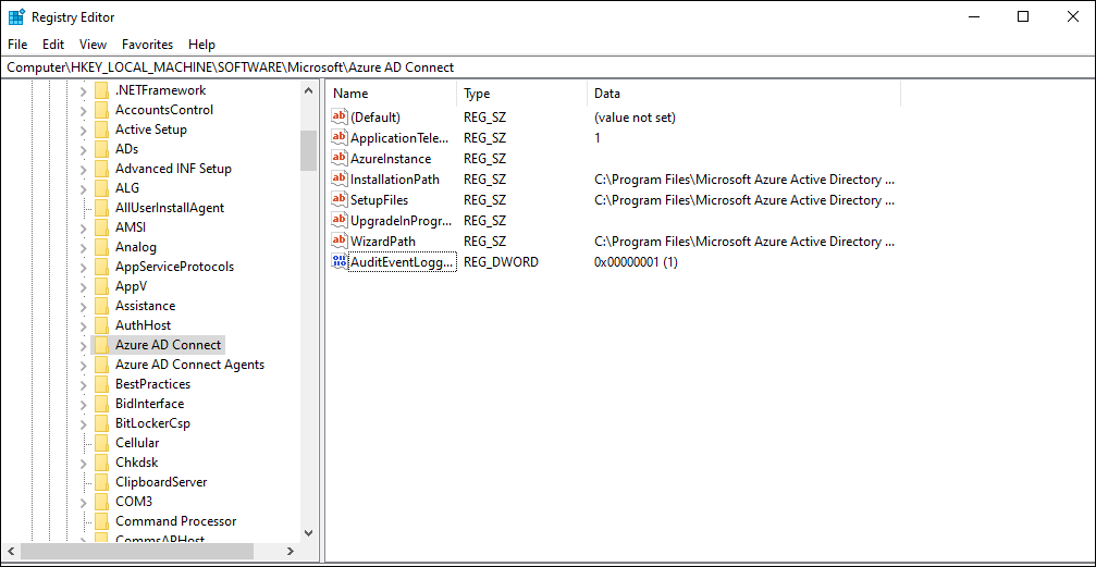 - Go to HKEY_LOCAL_MACHINE\SOFTWARE\Microsoft\Azure AD Connect.