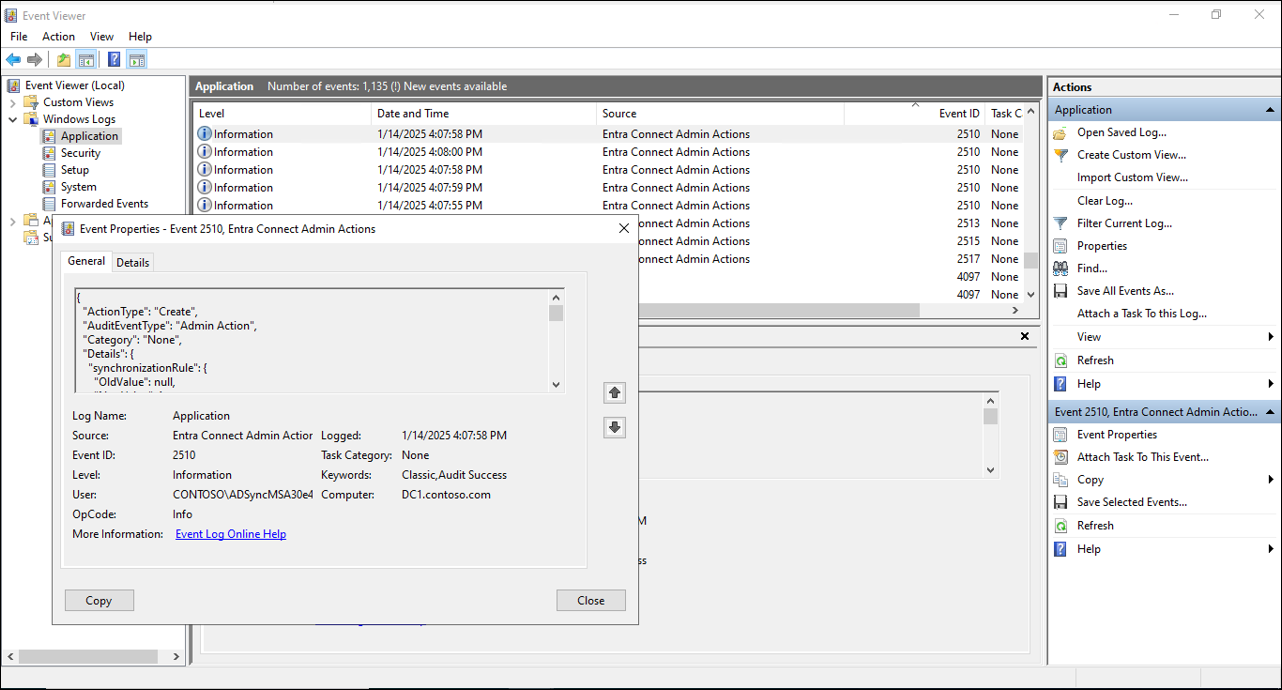 Admin actions performed through the Microsoft Entra Connect Sync Wizard, PowerShell, or the Synchronization Rules Editor—such as updates to synchronization rules, authentication settings, and federation settings are captured and logged in Windows Event Viewer Application's event log under a dedicated event source called Entra Connect Admin Actions. This provides improved visibility into identity infrastructure changes and supports troubleshooting, operational accountability, and regulatory compliance.